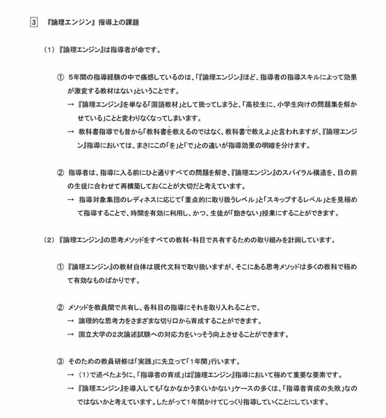 『論理エンジン』はやはり指導者が命。誰がどのように指導するのか、で『論理エンジン』は全く変わってしまうといっても過言ではありません。本校でも、多かれ少なかれ指導者によって導入初年度以降でも、『論理エンジン』がうまくいっている年とうまくいってない年があります。