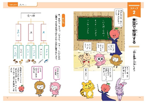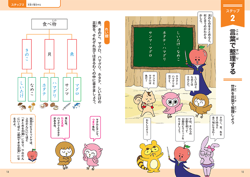 抽象度により階層が違う『言葉のピラミッド』に単語を当てはめたり、『仲間の言葉』のカードを見つけたりする練習から、一文と一文との論理的関係、文章の中での論理的関係と、徐々に学習難易度を上げていきます。