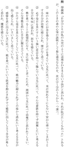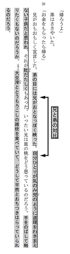 野口 ところが、兄は毅然とした態度を崩していません。自分は桃を食べたくて仕方がないのに、兄はそんなことに目もくれず、ひたすら自分に与えられた役目を果たそうとしている……。兄の大人っぽさに比べて、弟は自分のことを幼稚に思い、怒りを覚えているのが傍線部(自分ひとりが乳のみ児のように道理をわきまえない子供だと思われ、それが肚だたしくもあった)の意味することなのです。