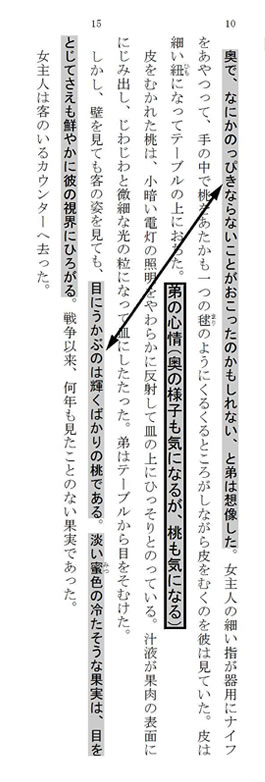 すると、5行目に「包みにかかわりがあると思われて弟は不安だった」、10行目に「奥で、なにかのっぴきならないことがおこったのかもしれない、と弟は想像した。」とあります。使いを果たしたはずなのに、何も状況が変わらないことに不安になっていることが分かります。にもかかわらず、目の前に出された桃を見たとたん、弟の目にうかぶのは「輝くばかりの桃」ばかりになってしまいます。