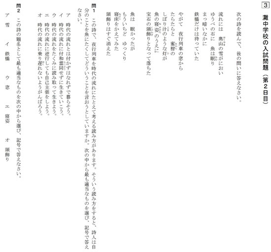 野口 最後に灘中学校の入試問題を紹介します。ここで取り上げられた題材は、詩です。一見、「論理」とは無縁だと思われる詩であっても、入試問題として出題される以上、論理的な分析を行う必要があります。