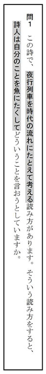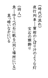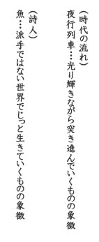 野口 ここから「夜行列車=時代の流れ」「魚=詩人(作者)」という関係が成立することになります。さらに、それぞれに関連する情報を詩から抽出すると以下のようになります。