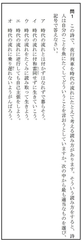 野口 詩人は、いたずらに時代の流れに乗るのではなく、自分の生活を守ろうとしています。したがって、「時代の流れに付和雷同(一定の主義・主張がなく、安易に他の説に賛成すること)せずに生きていこう」としているイの選択肢が正解です。魚は反抗的態度をとるものの象徴ではないので、エ「時代の流れに逆行しても」は誤りです。