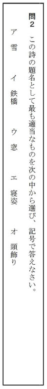 野口 次に問2について検討します。この詩は3つの連で構成されており、全ての連で魚が眠っている様子が描かれています。つまり、詩を通して魚=詩人自身の事を表現しているのです。そこで選択肢を見ると、エ「寝姿」とはもちろん魚のことで、つまり詩人自身を指しています。したがって、これは詩の題名としてふさわしいと言えます。他の選択肢の語句は詩の中で使われているものの、主題との関連性がありません。